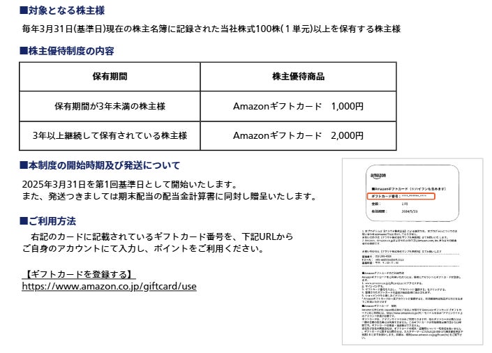 最大で一人につきAmazonギフトカードカード2,000円分の株主優待制度を導入