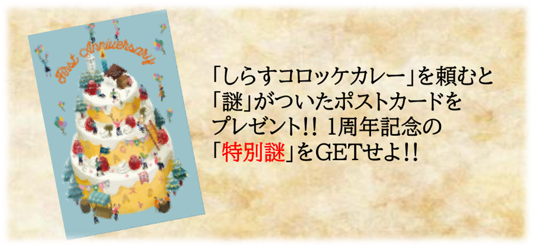 テイクアウトの1番人気商品「しらすコロッケ」をカレーにトッピングした期間限定メニュー。注文すると、この企画のために作成された謎付きポストカードをプレゼントいたします。