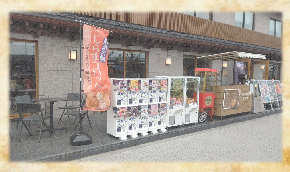 CAFEの正面にカプセルとクレーン機を楽しめるコーナーを新たに設けました。家族連れや外国人観光客も多い江の島。商品ラインナップも豊富に取り揃えておりますので、CAFE利用と併せて是非、お立ち寄りください。