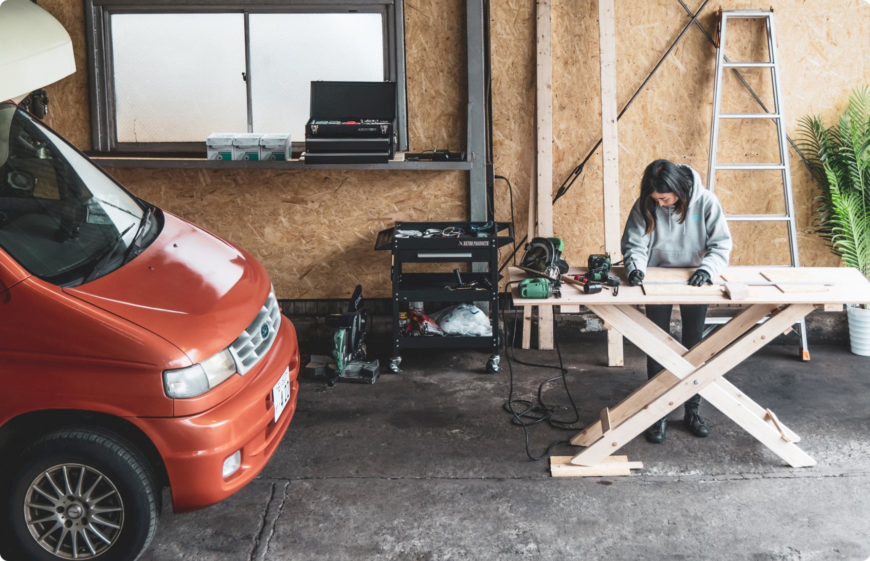 バンライフのDIYをしたくても、場所が見つからない方のために、屋内ガレージのスペースを貸出します。ホームセンターから車で15分の好立地で、音や周りの目を気にせず作業に集中できる環境です。「Mobi Lab.」スタッフが適宜アドバイスします。