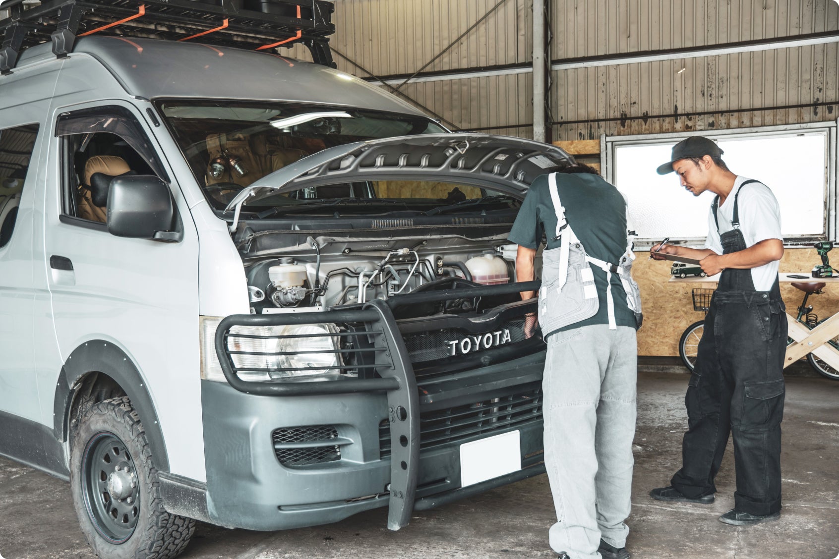 キャンピングカーのメンテナンス・修理を受け付けます。バッテリーなどの電装系統の点検、テーブルやベッドキットなどの家具の修理、オイル、エレメントの交換など、キャンピングカーの“困りごと”を解決します。車体の傷や凹みなどの、板金・塗装業務も行います。(自動車整備士が行う、点検整備・分解整備・車検などの業務は取り扱っていません)