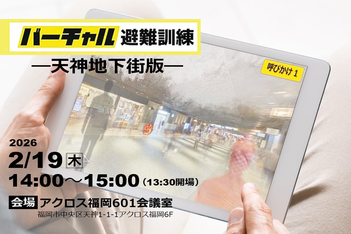 福岡市都心部の街づくりを推進する「We Love 天神協議会(WLT)」、「天神明治通り街づくり協議会(MDC)」、「博多まちづくり推進協議会(博多まち協)」、福岡地域戦略推進協議会(FDC)、福岡市市民局および福岡地下街開発株式会社、株式会社ジオクリエイツ、株式会社日建設計、公益財団法人九州先端科学技術研究所(ISIT)が連携し、福岡都心エリアの防災力の強化を目的とした 『バーチャル避難訓練-天神地下街版-』 を2026 年2 月19 日(木)に実施します。
