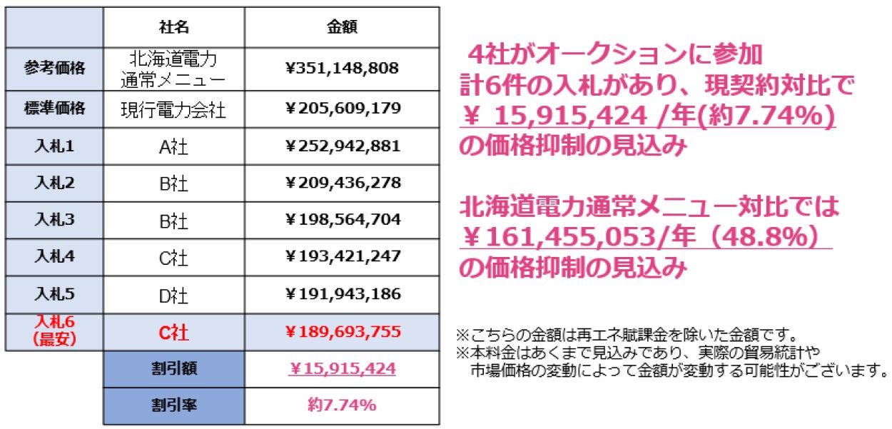 結果として、上記のような課題を解決するとともに来年度の電気料金の低減を見込むことができる電力契約の選定をすることができました。