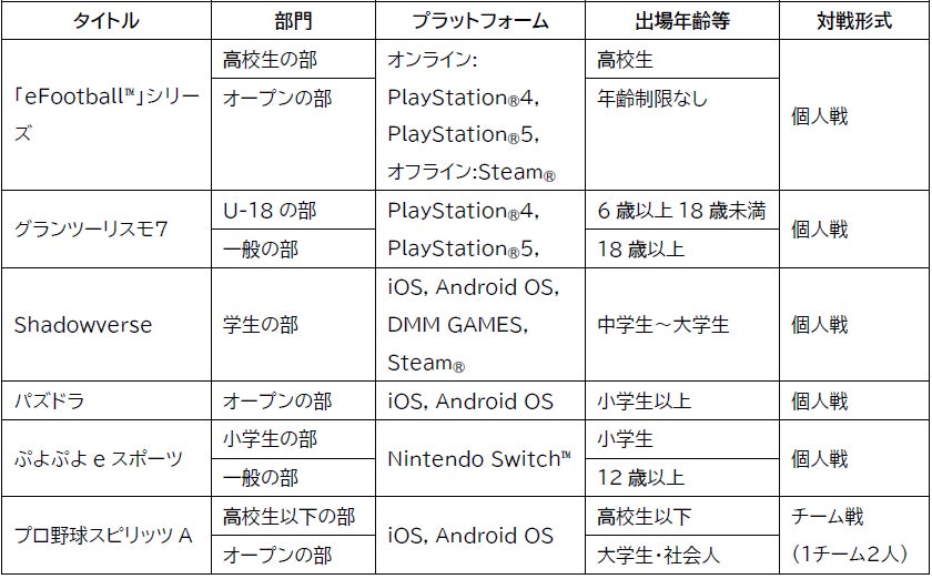 「eFootball™」シリーズは、8月下旬よりブロック大会を開催予定です。「Shadowverse」は、8月1日(月)から26日(金)にかけて、「都道府県予選」を全都道府県にてオフラインの大会形式で実施します。スケジュールなどの詳細情報は、特設ページをご確認ください。