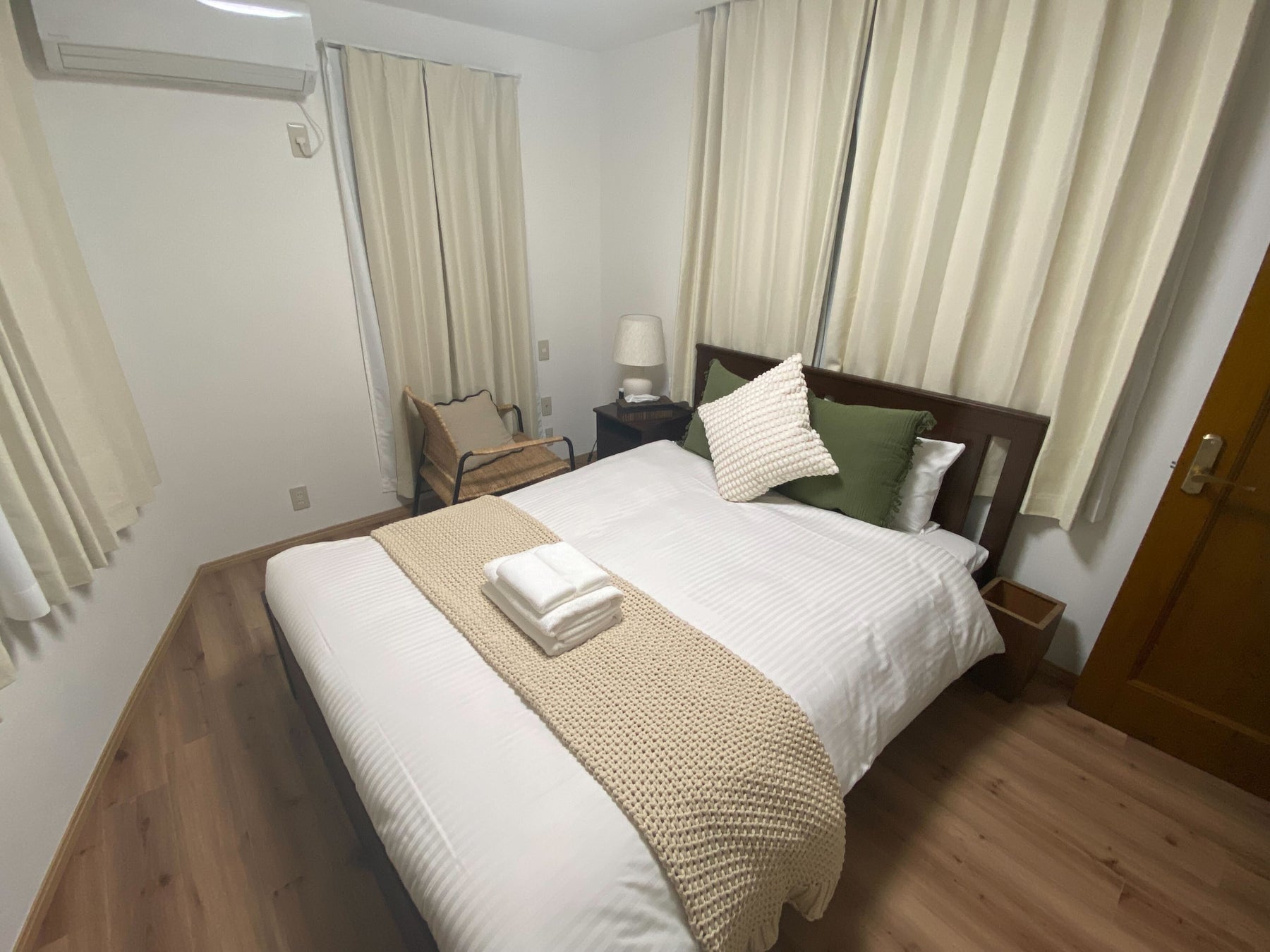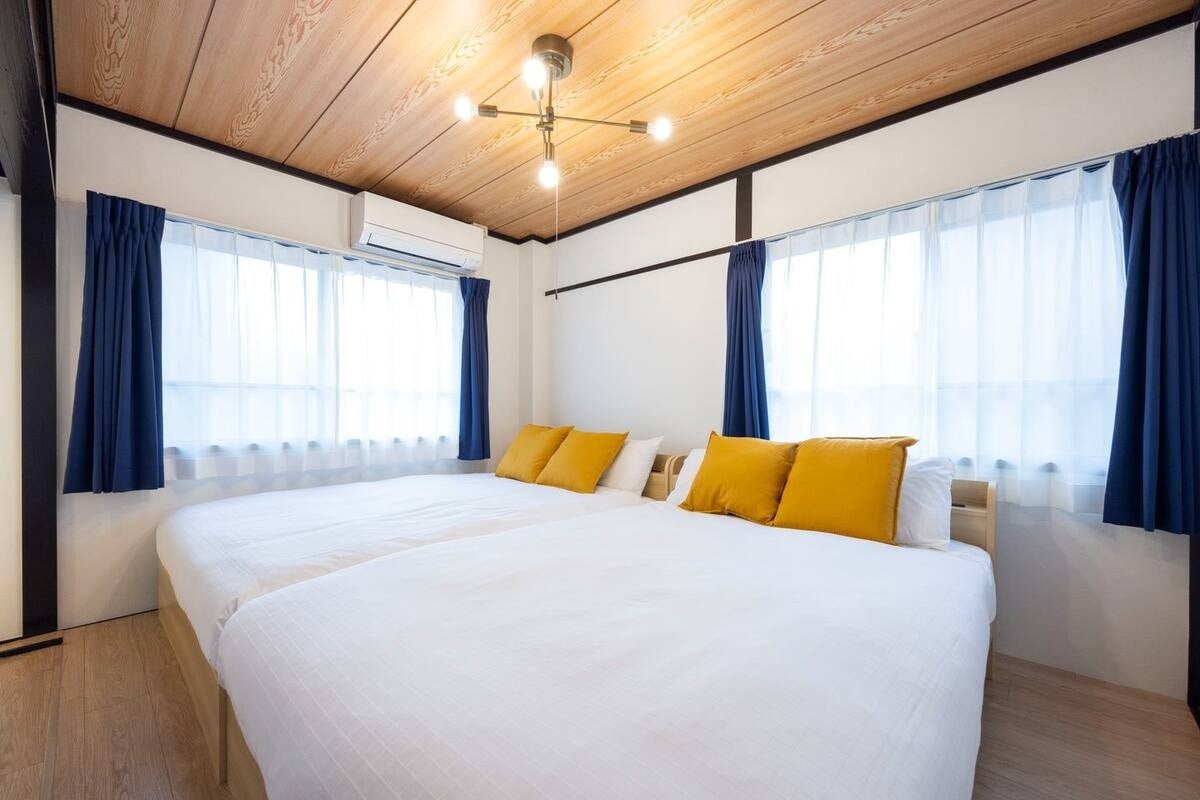 本物件の再生にあたっては、壁紙の一部に異なる色や柄を取り入れる「アクセントクロス」や比較的グレードの高い設備を導入しました。また、民泊施設のため、サイズの異なる寝具の設置、連泊やワーケーションにも便利なWi-Fi設備、デスク等の設置など、さまざまな国や年齢の方々が利用いただくことを想定した仕様となっています。