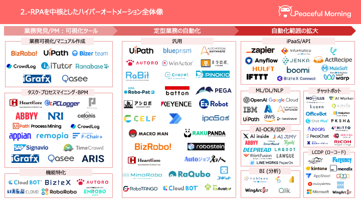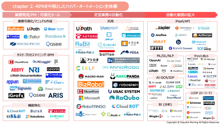 RPA・AIなど自動化ツールの活用をプロが伴走してサポートする「Robo Runner(ロボランナー)」、グループ累計700万名のDXエンジニア・コンサルタントが登録する「DX Boost」等、AI・RPA領域における包括的なDX推進支援サービスを展開するPeaceful Morning株式会社は、RPA市場の最新動向と、RPAを中核としたハイパーオートメーションの全体像を整理したホワイトペーパー「RPAカオスマップ2026」 を公開しました。