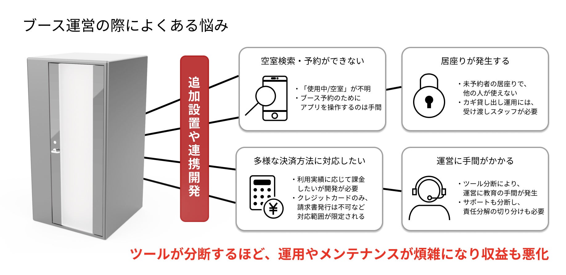 リモートワークの浸透に伴い、「ワークブース」のニーズは急激に高まっており、普及台数の増加にあわせて、公共の空間や商業施設に設置したワークブースを有償・時間単位で貸し出すサービスの展開が加速しています。そのような状況において、マンション・ビル・商業施設などの運営者は、「ワークブースを設置したいが、カギや請求との連携に手間や大きなコストが掛かる」「確実に使えるよう”予約”するニーズに応えたい」といったワークブースだけでは対応できない課題も生まれています。