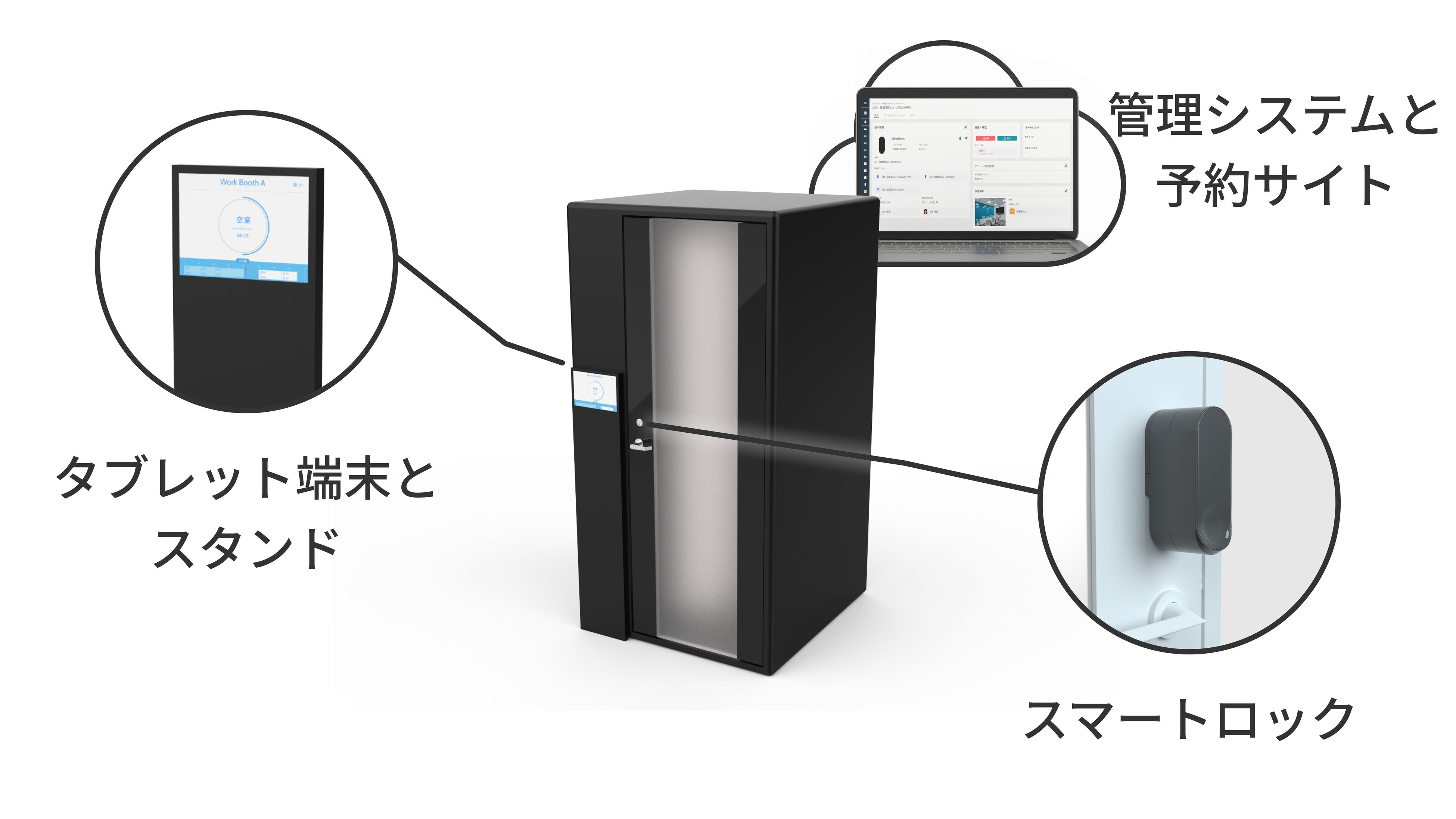 ワークブース本体、利用者向けワークブース検索・予約システム、スマートロック、管理者向けシステムなどを全て揃えており、個別のシステムや製品を契約することなく、設置後すぐに運営を開始できます。