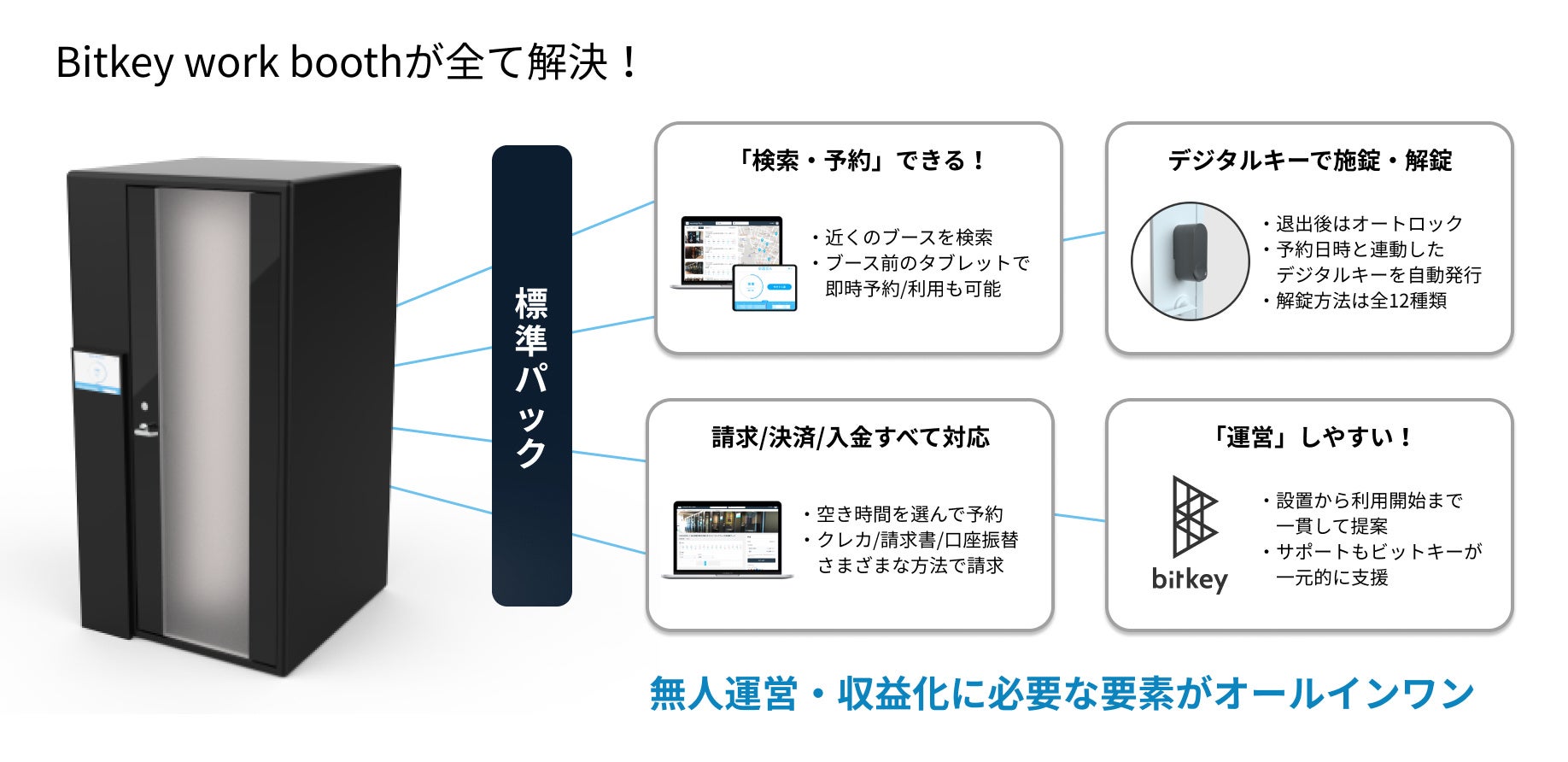 今回、これらの課題を解決すべく、ワークブース本体の提供に加え、利用者がワークブースを予約できるWebサイトや、予約した時間に連動したデジタルキーの発行から、集計・請求・決済までの一連の運営業務に対応するシステムをパッケージ化したスマートワークブース「Bitkey work booth」を開発しました。今後は全国数万台の設置を目指し、2022年中に2,000台の設置を目指します。