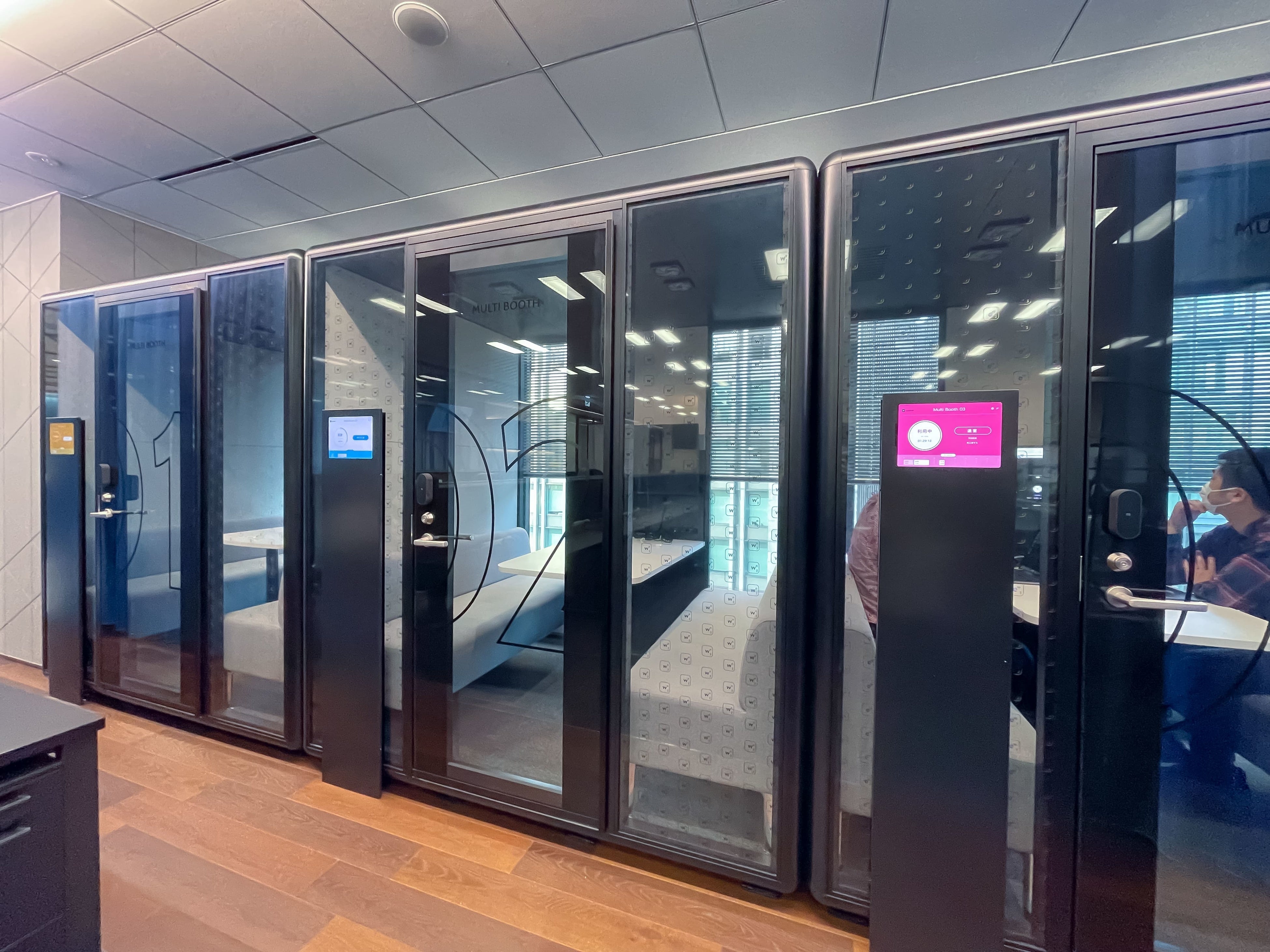 ブース外に設置したタブレット端末で空き状況やその日の予約一覧を可視化しており、即時予約も簡単にできる