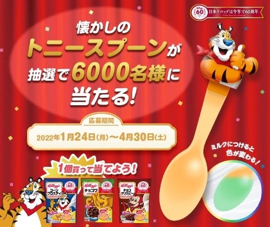 シリアル食品の世界シェアトップブランド「ケロッグ」を日本国内で展開する日本ケロッグ合同会社(本社:東京都千代田区、代表職務執行者社長:井上ゆかり)は、1962年に設立してから今年で60周年を迎えました。この記念すべき1年を彩る60周年企画の第1弾として、長年子どもから大人まで愛され続けているコーンフロスティとココくんシリーズの復刻版パッケージデザインを数量限定で新発売*いたします。さらに、ケロッグのおまけの代名詞とも言える懐かしの、トニーの色が変わるスプーンが抽選で6,000名様に当たるクローズドキャンペーンも実施いたします。*一部取り扱いの無い店舗がございます。