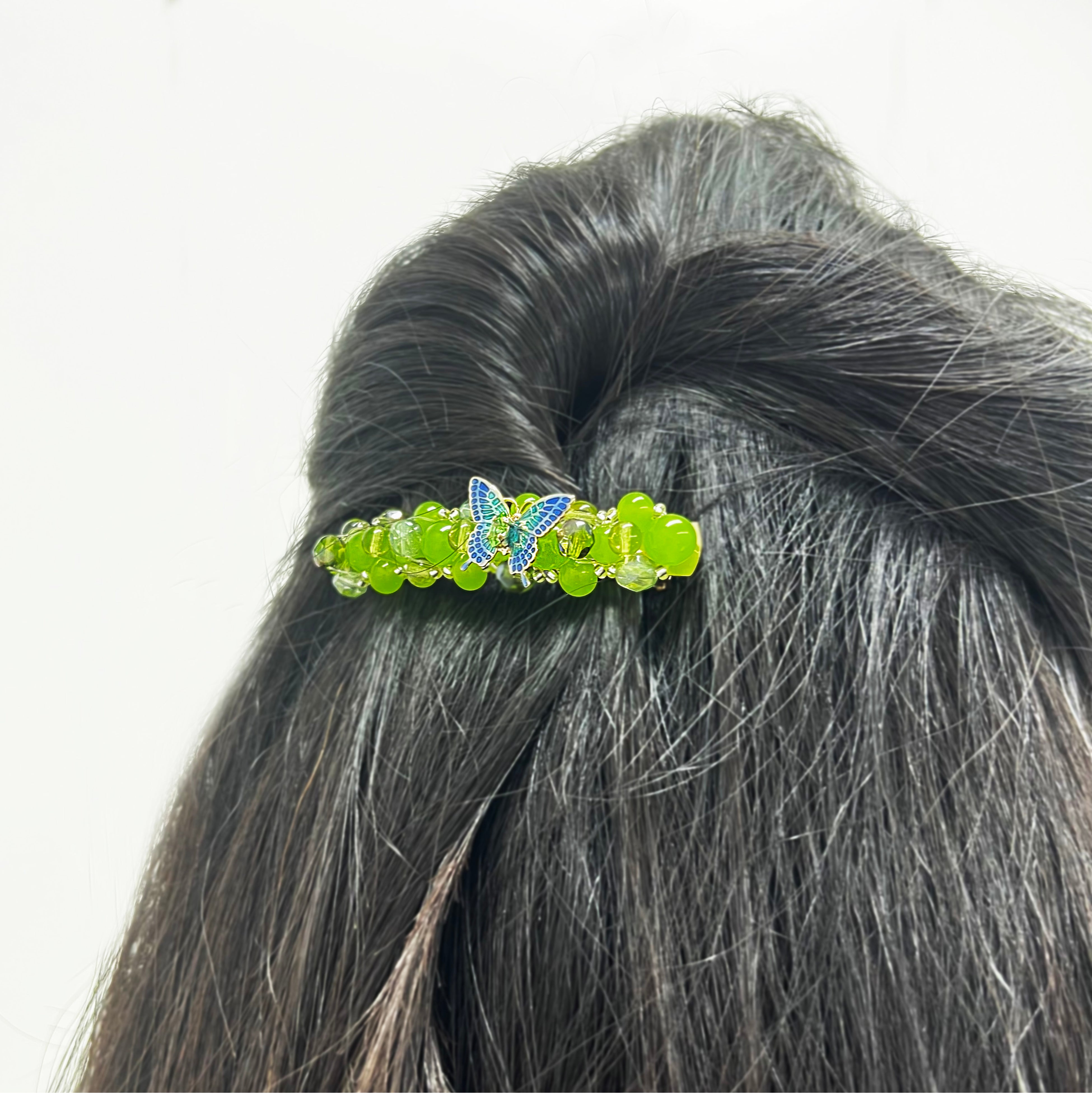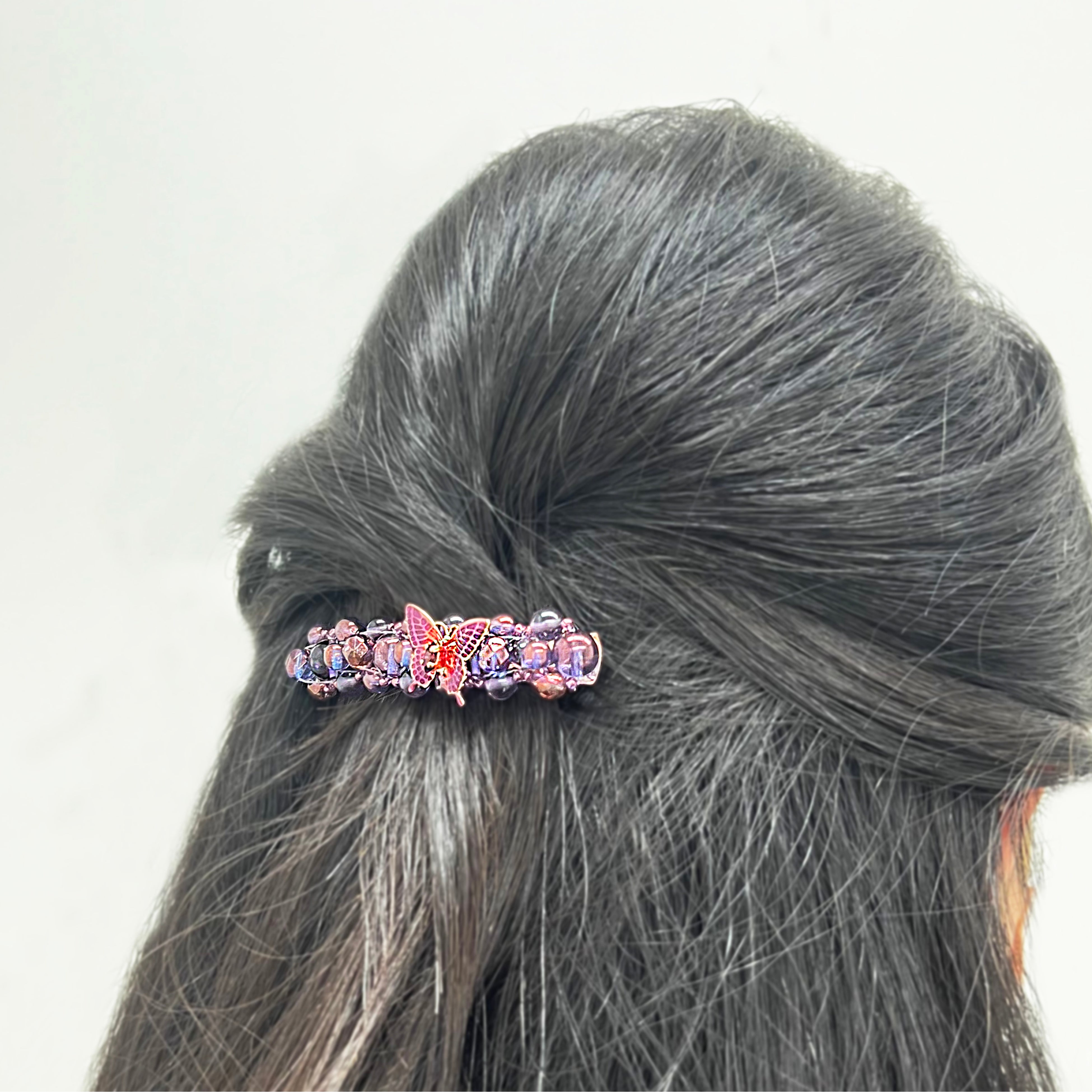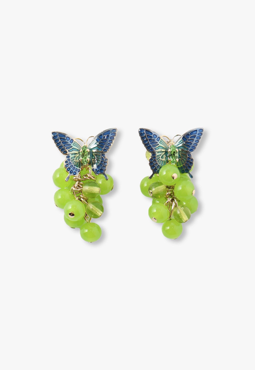 透明感のあるガラスの質感がぶどうの瑞々しさを表現し、発色の良い艶やかな蝶モチーフが彩りを添えるデザイン。