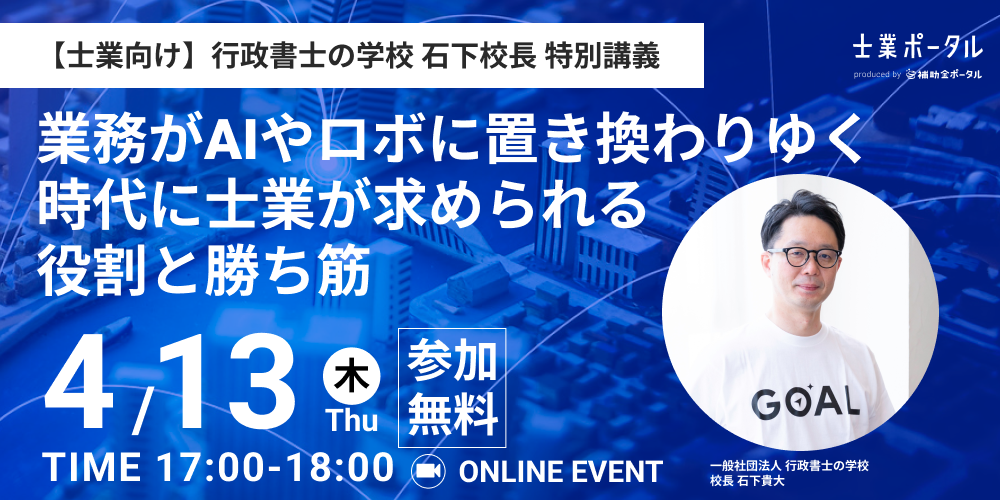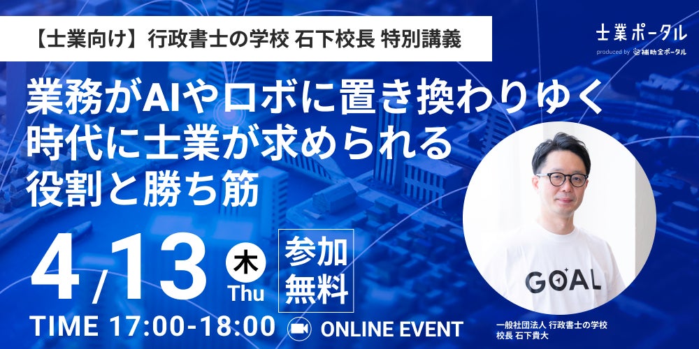 株式会社補助金ポータル(本社:東京都渋谷区、代表取締役:福井彰次 以下、「補助金ポータル」)は、一般社団法人行政書士の学校(本社:東京都渋谷区、代表者行政書士 石下貴大)と「業務がAIやロボに置き換わりゆく時代に士業が求められる役割と勝ち筋」と題して、無料のオンラインセミナーを開催いたします。Zoomでお気軽にご視聴いただけますので、是非ご参加ください。