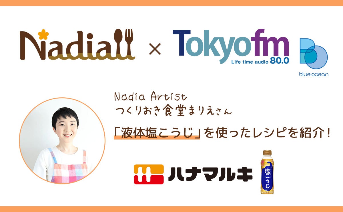 人気レシピサイト「Nadia」とTOKYO FMのレギュラー番組『Blue Ocean』のコラボ企画が始動♪第一弾はハナマルキ「液体塩こうじ」を使ったレシピをつくりおき食堂まりえさんが番組内で紹介!