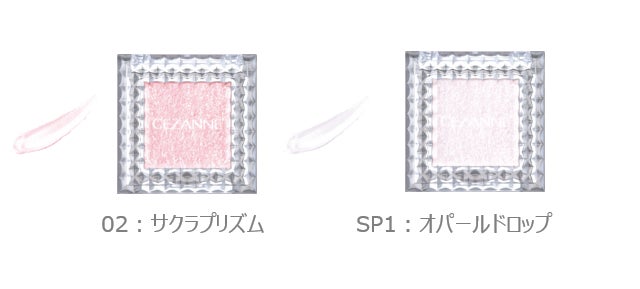 「セザンヌ シングルシャイニーアイシャドウ」は高密着と高輝度が魅力のラメシャドウ。新色「02 サクラプリズム」はサクラの花びらをイメージしたピンクカラー。華やかなきらめきとパールの効果で、目元に湿度とうるみ感を演出します。限定色「SP1 オパールドロップ」は10月の誕生石である「オパール」をイメージしたカラー。光の角度で色が変わる偏光パールをたっぷりと配合し、幻想的な色味を表現いたしました。