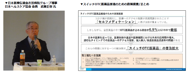 武藤氏からは、「医師の働き方改革のことも考慮に入れると、医師と薬剤師が協働して患者の治療に携わる医療が広がる中で、OTCの価値を見出していくことが重要だ」とのコメントがあり、「生活習慣病薬」「ED治療薬」「性感染症検査薬」がOTC化なされた場合のベネフィットについてもケーススタディとして言及がありました。そのうえで、セルフメディケーション推進のためにスイッチOTC医薬品の普及拡大の必要性と必要な施策を提言として発表いただきました。