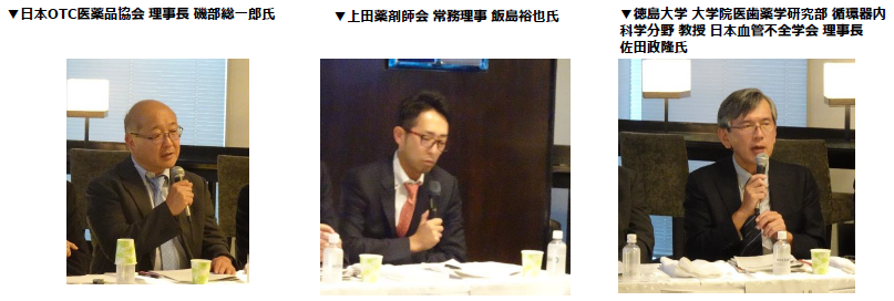 基調講演の後に、日本OTC医薬品協会 理事長 磯部総一郎氏、上田薬剤師会 常務理事 飯島裕也氏、徳島大学 大学院医歯薬学研究部 循環器内科学分野 教授 日本血管不全学会 理事長 佐田政隆氏を交えまして、3つのテーマ(テーマ①『スイッチOTC化の課題と社会的なベネフィット』テーマ②『スイッチOTC推進がもたらす消費者へのベネフィット』テーマ③【スイッチOTC推進のために政府が取り組むべきこと』)について、パネルディスカッションを行いました。磯部氏からは「品質が確保されたスイッチOTCという選択肢があるということが重要。偽造薬のリスクから守るという視点でも考えるべきだ」とのご意見を頂戴し、飯島氏からは「スイッチOTCが進めば、薬剤師の重要性が増して薬局が地域住民のファーストアクセスの場となり、医師の負担軽減や国民皆保険制度の持続性確保につながる」とのコメントを頂戴しました。さらに、佐田氏からは「薬剤師がOTCを活用して服薬指導をし、必要に応じて医師につなぐ医療の実現が重要だ」としてスイッチOTC医薬品の利活用拡大を支持するご意見がございました。