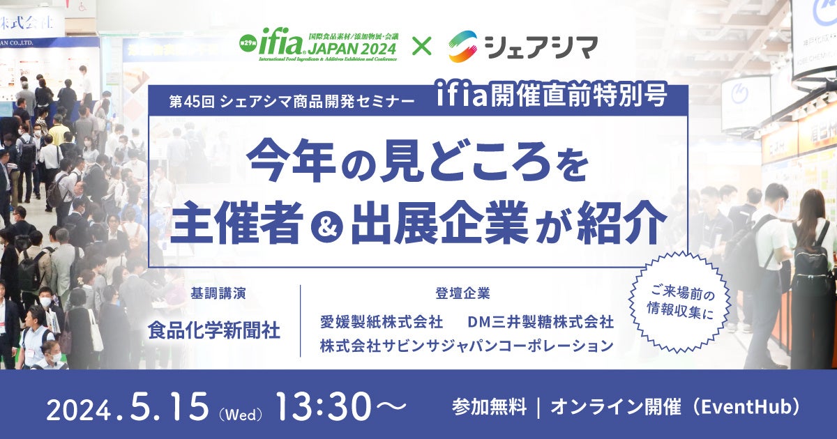 展示会 開催1週間前に行われる「ifia×シェアシマ特別セミナー」では、食品開発の最新情報を発信する当展示会の見どころと注目の登壇企業をご紹介します。