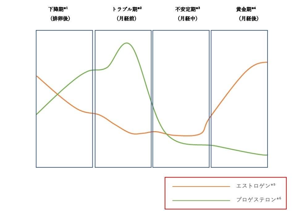 *²トラブル期(月経前):ニキビや吹き出物などの肌トラブルが現れやすい時期