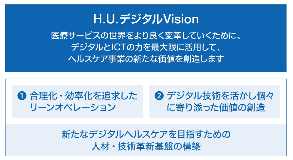 当社グループは、MissionとVisionの実現に向けた経営変革のため、H.U.デジタルVisionを策定し、DXを「合理化・効率化を追求したリーンオペレーション」、「デジタル技術を活かし個々に寄り添った価値の創造」の2つの軸で推進しています。また、新たなデジタルヘルスケアを目指すための人材・技術革新基盤の構築を進めています。