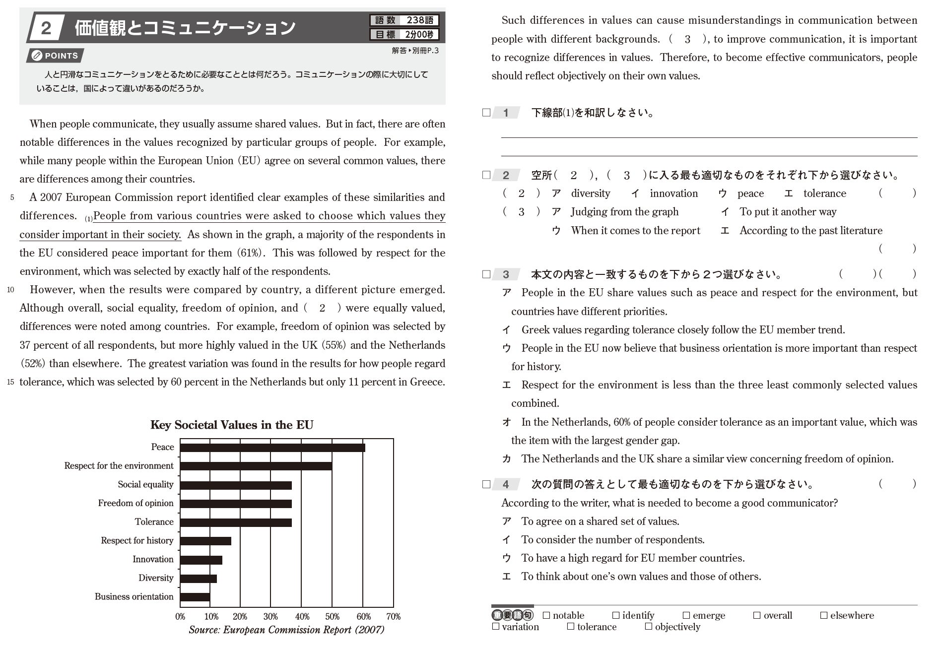 英語長文、英語長文読解ともに、読むスピードを意識できるように、目標時間と語数を表示し、WPM記入欄を設けました。またグラフや表の入った問題や記述問題を取り入れるようにしています。