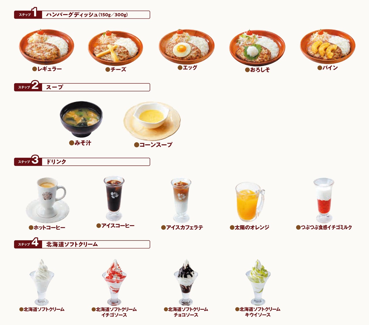 ドンキー満喫セットはハンバーグディッシュ、スープ、ドリンク、デザートの中からそれぞれ1つずつお好きな商品を選ぶことができます。
