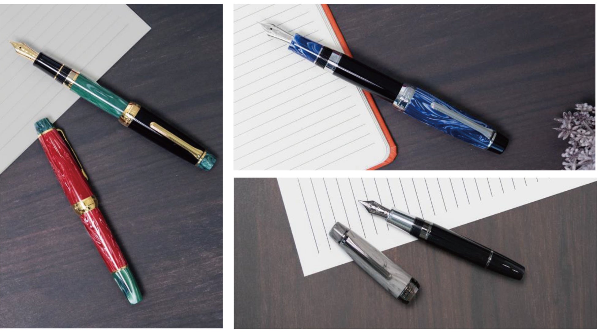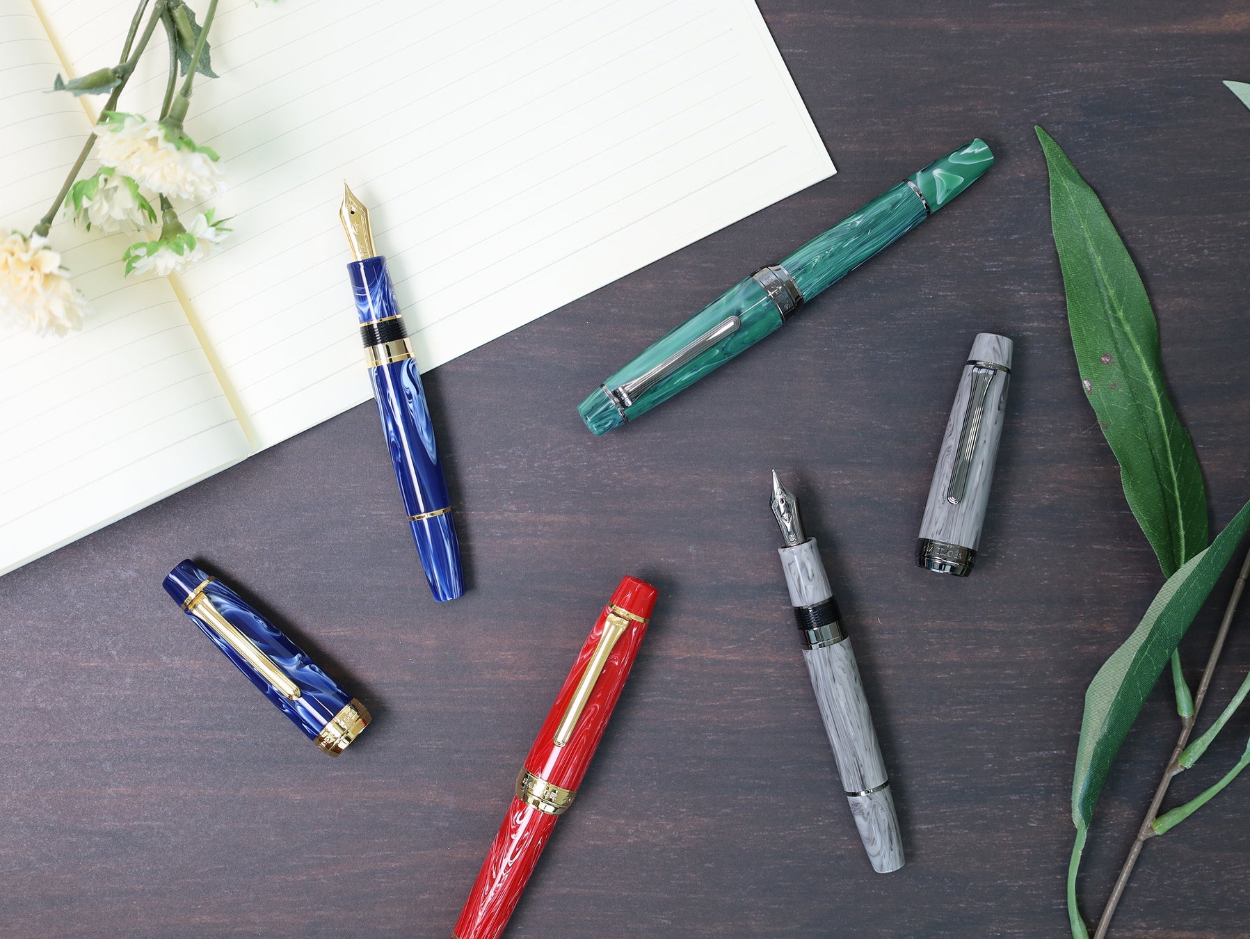 カラーはマーブルのレッド、ブルー、グリーン、グレーの4カラーと、不透明色のブラックを合わせた計5カラー。ペン先及び金属パーツはゴールド、シルバー、ブラックの3種類からカスタマイズ可能。