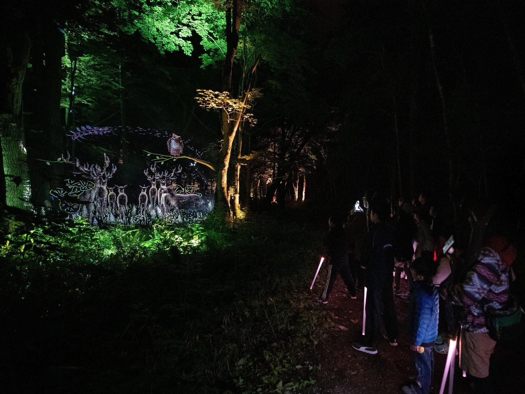 北海道釧路市、阿寒摩周国立公園に指定された阿寒湖の森で開催する「阿寒湖の森ナイトウォーク KAMUY LUMINA 」は、世界トップレベルのマルチメディア・エンターテインメント・カンパニー、 「モーメント・ファクトリー社」が制作。アイヌの杖をモチーフにした「リズムスティック」を手に様々な演出や仕掛けで幻想的な夜の森(全長約1.2 kmの遊歩道)を散策しながら、”自然との共生”の大切さを伝えるアイヌの物語が体験できます。子どもから大人まで、参加者が登場人物の一員となってアイヌ文化の世界観や阿寒湖の自然美を五感で触れることができる新感覚の体験型アクティビティです。