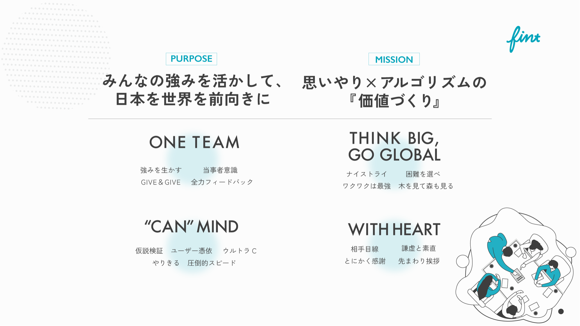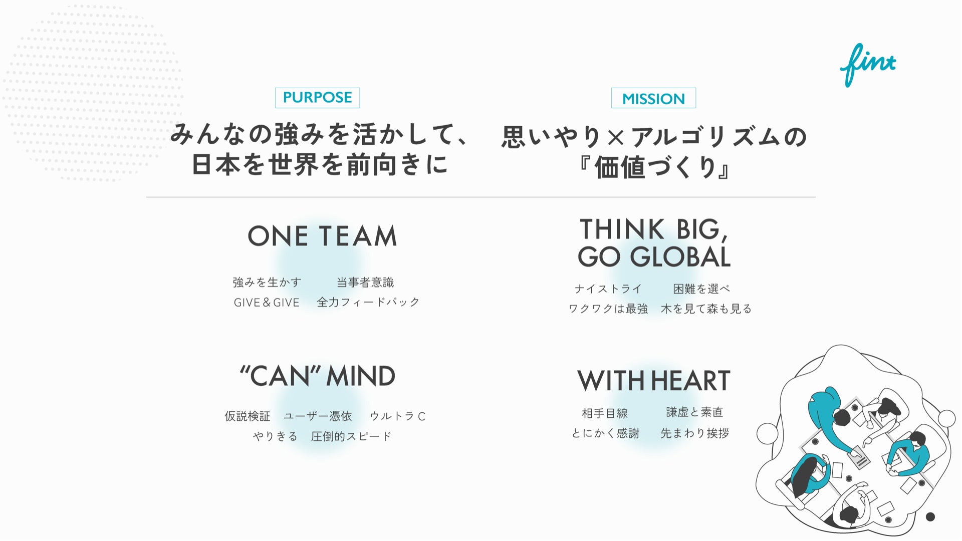 パーパスである「みんなの強みを活かし、日本を世界を前向きに」には、日頃から「好き」や「得意」を大事にしているFinTの価値観が表れ「みんなの強みを活かし」という言葉ができました。個人、会社、ひいては日本の国そのものの「強み」に着目し、それらを活かすことによって、FinTという会社から日本を世界を前向きにしていきたい、という大槻の想いが込められています。