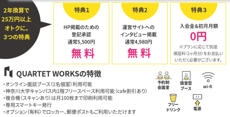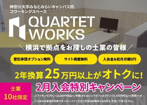 株式会社SoLaboは、神奈川大学みなとみらいキャンパスにおいて運営する起業家向けコワーキングスペース「QUARTET WORKS(カルテットワークス)」にて2月入会特典として【士業限定】の特別キャンペーンを実施いたします。