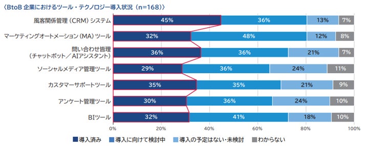・BtoB企業のテクノロジー利活用状況は、顧客接点のベースとなるCRM(顧客関係管理)システムの導入率が高く、先進技術の導入では「生成AI」や「機械学習」への導入意欲が高い。