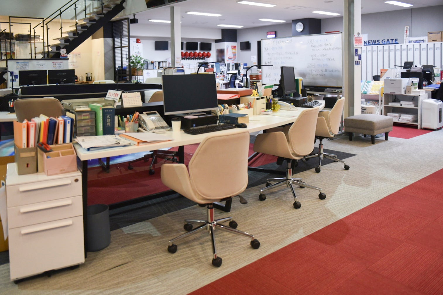 報道スタジオに隣接する1階フロアでは、THE TABLE / ラバーウッド ナチュラル × Black Steelを設置。白や赤を基調としたスタイリッシュな空間の中に、木のぬくもりが溶け込み、柔らかなコントラストを添えています。ベージュのデスクチェアやリノリウム天板を使用した電動昇降デスクなども採用され、スマートで洗練された報道フロアを演出しました。