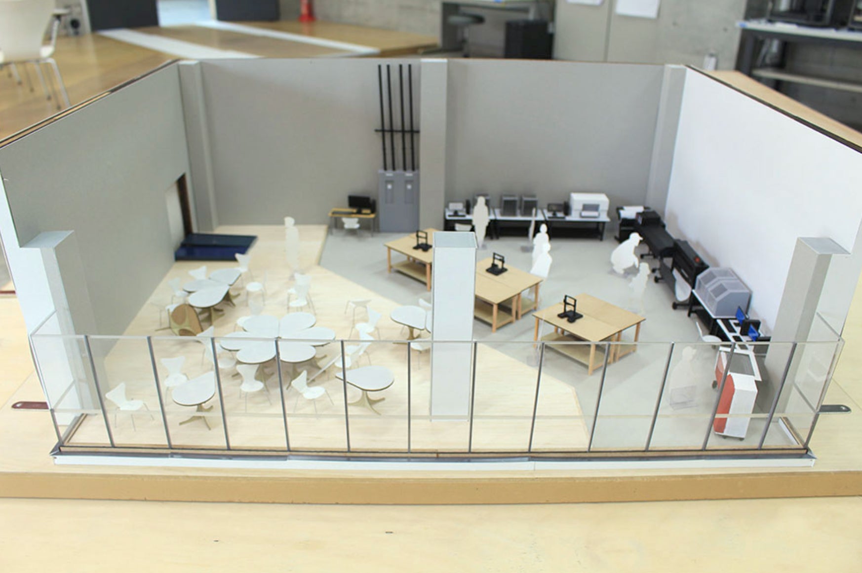 ものつくりベースの意匠設計とデスクや椅子等の什器の設計・製作は、理論と実技を融合したカリキュラムを重視した教育を行ってきたものつくり大学らしく、大学院の学生らによって行われました。