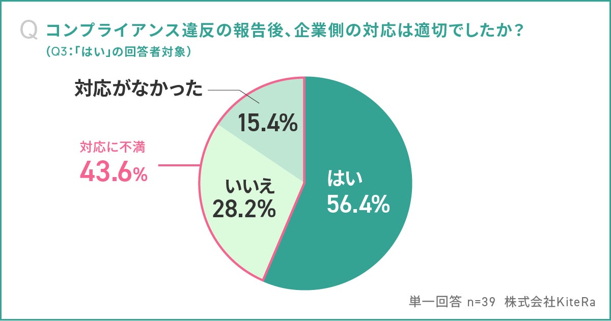 43.6%が、コンプラ違反報告後の対応に不満(”不適切” または ”対応なし”)