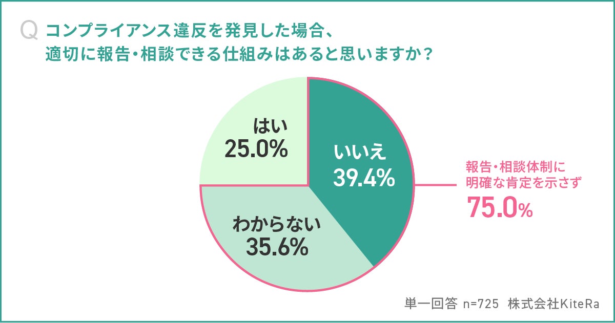 「コンプライアンス違反を発見した場合、適切に報告・相談できる仕組みがあると思いますか。(単一回答)」と聞いたところ、回答数が多い順に「いいえ」が39.4%、「わからない」が35.6%、「はい」が25.0%という結果となりました。