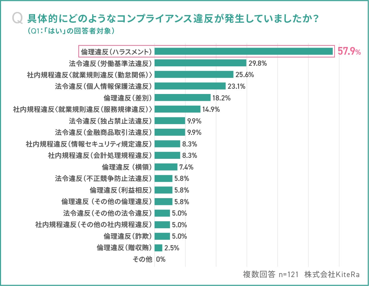 【Q2】社内コンプラ違反、最多は「ハラスメント」57.9%。労働基準法違反も明らかに