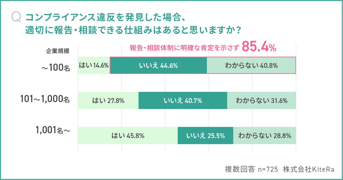 コンプライアンス違反の報告・相談体制について、企業規模別に調査した結果、従業員100名以下の企業では、8割以上(85.4%)が「いいえ(報告・相談できる仕組みがない)」または「わからない(仕組みがわからない)」と回答し、小規模企業において報告・相談体制に明確な肯定を示していない現状が示唆されました。
