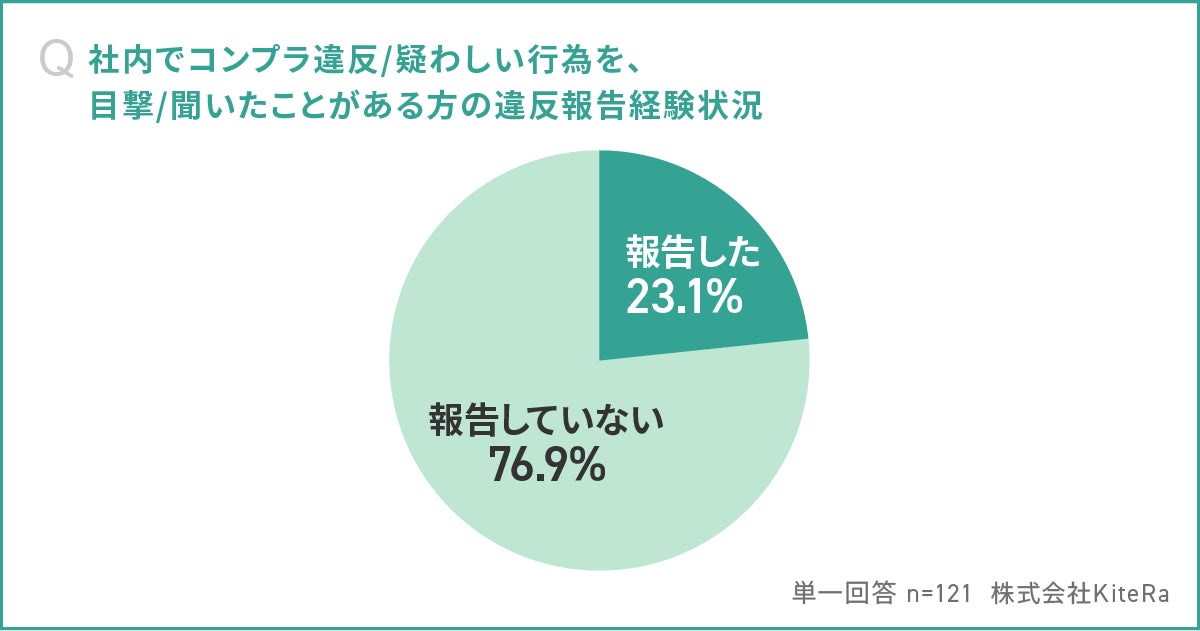 しかし、コンプライアンス違反を目撃または耳にした従業員のうち、実際に報告した経験があるのはわずか23.1%にとどまるという結果です(※2)。つまり、76.9%の従業員が、コンプライアンス違反を目の当たりにしながらも「見て見ぬふり(報告経験なし)」をしているという驚くべき実態が明らかになりました。