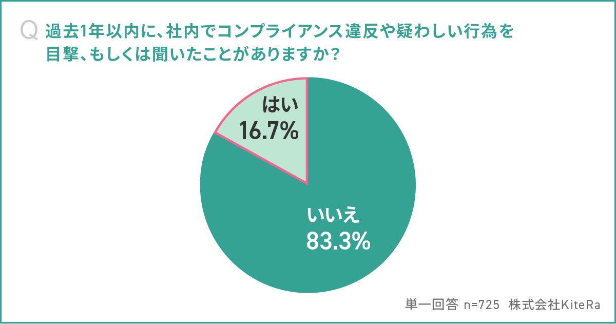 「過去1年以内に、社内でコンプライアンス違反(または疑わしい行為)を目撃、もしくは聞いたことがありますか。(単一回答)」と聞いたところ、「はい」が16.7%、「いいえ」が83.3%という結果になりました。