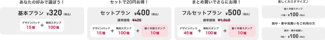 内容 | デザインパック1パックに、スマートねんがで使える無料スタンプ100種を含んだプラン。 | 基本プランに、おすすめの「動く年賀スタンプ」10種(有料・100円(税込))を含んだプラン。 | 喪中・寒中見舞いを除く、全てのデザインパックおよびスタンプが使い放題のプラン。 | 9種類のデザインテンプレートを1パックにしたセット。 |