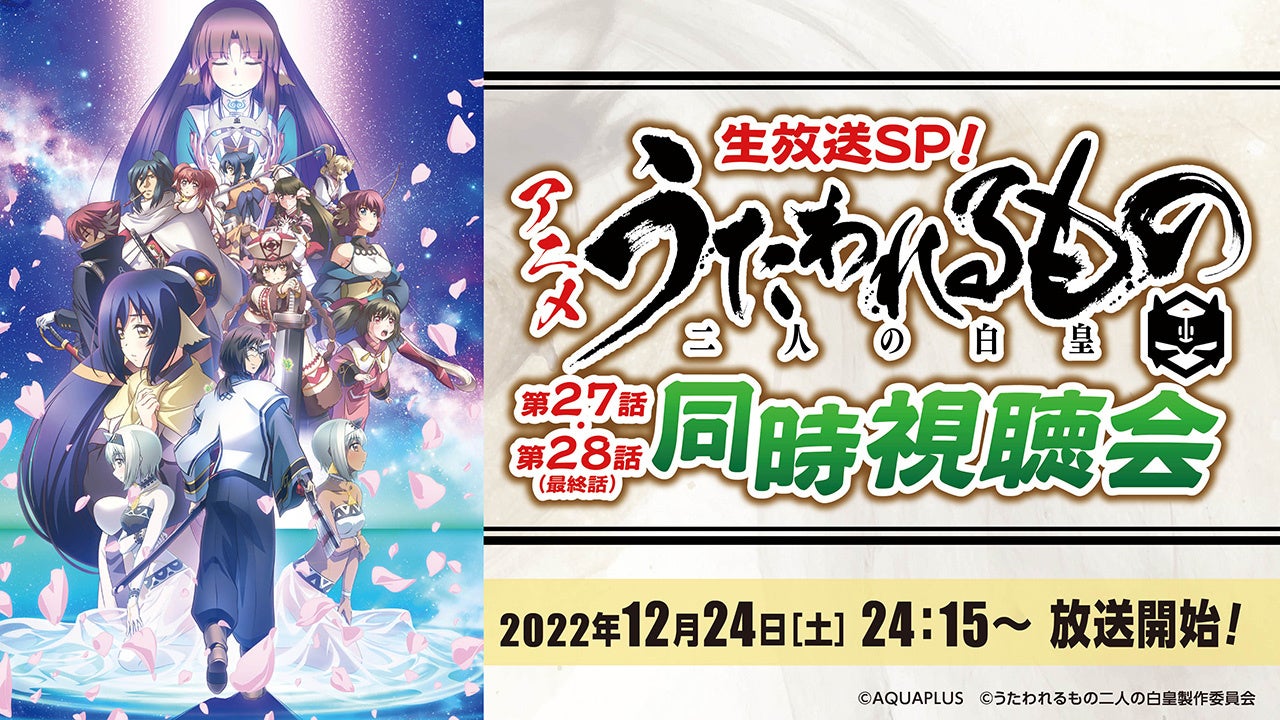 株式会社アクアプラス(以下アクアプラス)は、最終話を迎えるTVアニメ『うたわれるもの 二人の白皇』を記念した特別番組「生放送SP!アニメ『うたわれるもの 二人の白皇』第27話・第28話(最終話)同時視聴会」を、本日12月24日(土)24時15分より配信いたします。
