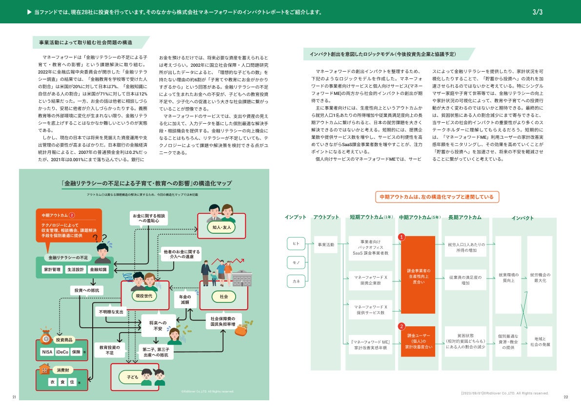 当ファンドの投資先の1つである株式会社マネーフォワードのインパクトレポートを紹介しています。レポートでは、企業の取り組みが本質的な社会課題解決に結びついていることを示すために、ロジックモデルに加えて社会課題の全体構造を整理した「構造化マップ」を掲載しています。同社の場合は、個人向けサービスであるマネーフォワードMEが「金融リテラシーの不足による子育て・教育への影響」という課題解決に繋がっていることを明示しています。