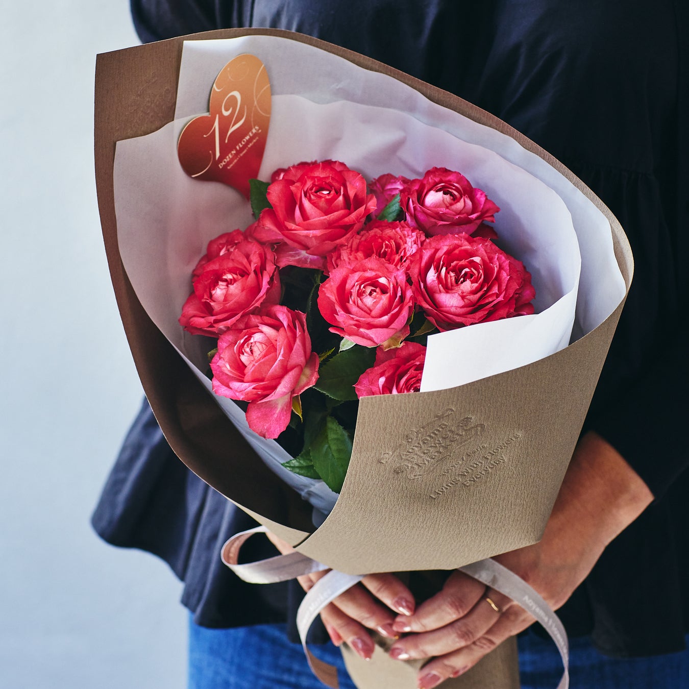 普遍的、神聖な「12」の数字にちなんで、愛を込めた 12 本の花束を。「ダズン」とは 12の数字のこと。古来より「12」は重要な数字とされてきており、1年の12ヶ⽉や、時間の12時間など、完璧で、完全な象徴であります。そんな普遍的で神聖な「12」を12本の花束に愛を込めて。愛を贈るこの季節にふさわしいダズンフラワーズブーケをご⽤意いたしました。