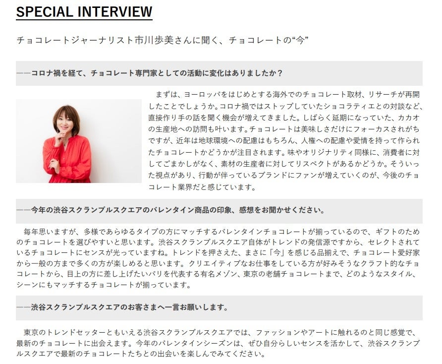 ぶ商業施設です。今回は、メディアで幅広く活躍しているチョコレートジャーナリストの市川歩美さんをお迎えし、2024年のバレンタインシーズンのトレンドや、チョコレート業界の“今”についてお聞きしました。チョコレート業界を熟知して