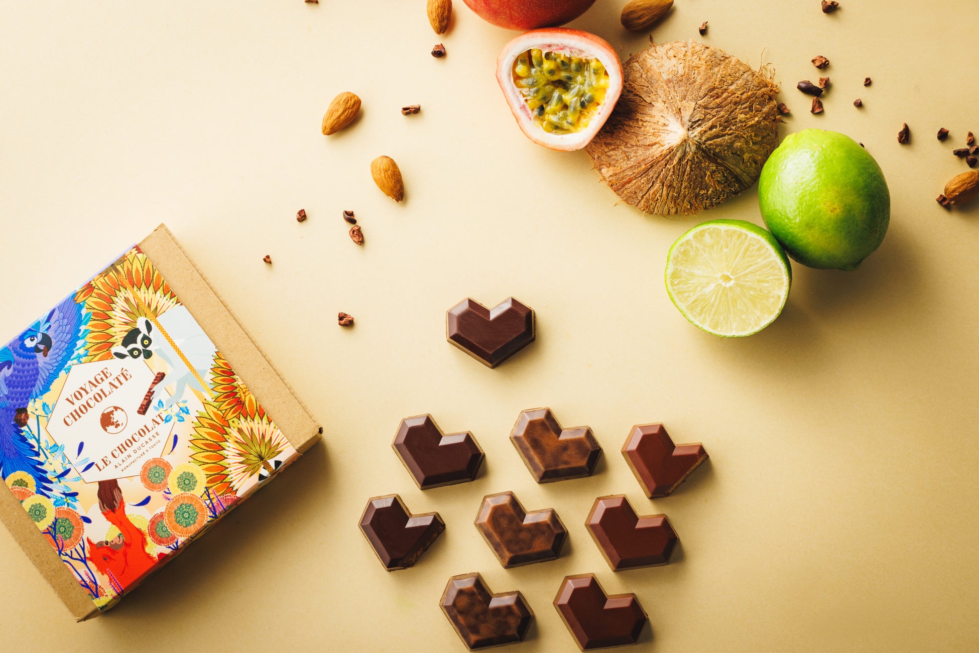 ハート型のショコラ「ペピクール」ライム&ココナッツ/パッションフルーツ&ココナッツ/アーモンド。2024年バレンタインは3種の味を詰め合わせました。日本限定のライム&ココナッツやパリでもバレンタイン期間販売されるパッションフルーツ&ココナッツ、人気のアーモンドの3フレーバー。バレンタイン限定パッケージはフランスでも人気のイラストレーター、シャルロット・ガストーによるデザイン。カカオ産地を象徴する動物たちが華やかに描かれています。