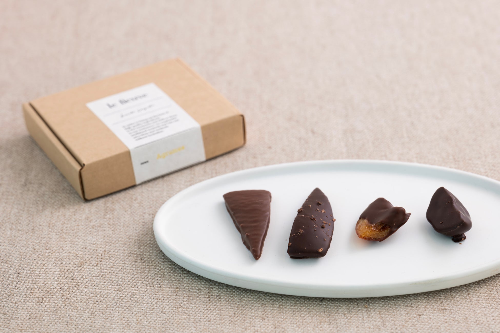 兵庫県北部の自然豊かな山あいに工房を構える「ル フルーヴ」は“農家さんと一緒に作るお菓子”をテーマにした、シェフの味覚による妥協のない素材選びが特徴。全て顔の見える農家さんから届いた伊予柑・金柑・ブラッドオレンジ・レモンの4種類。柑橘畑でもぎたての果実をかじるよう瑞々しい素材感を表現しました。1個ずつ大切に皮を剥き、火入れをし、カットする。全て手作業で時間も手間もかかりますが、柑橘もカカオも国内・海外の農家さんに大事に育てられた素材の おいしさを最大限に引き出してあげたい、そんな思いが詰まったアソ ートです。