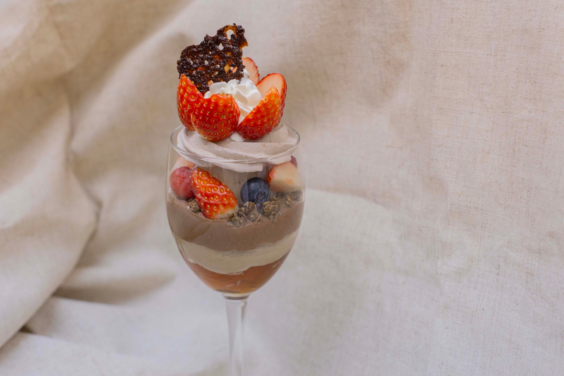 ⼤⼈な味わいを引き⽴てるほうじ茶を使⽤した⾃家製のゼリーやクランチ、クリームに、この時期に⾷べたくなるチョコレートを組み合わせたバレンタインシーズン期間限定のパフェが登場します。アクセントには苺、ブルーベリー、フランボワーズのベリーなどの⽢酸っぱさを加えました。