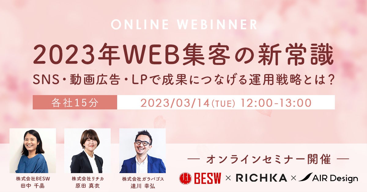 企業のSNSマーケティング支援を行う株式会社BESW、動画制作のプロ集団・株式会社リチカ、AIやデータ活用によるWebマーケ企画とクリエイティブ制作・改善サービス「AIR Design」を展開する株式会社ガラパゴスの3社が、それぞれの専門領域であるSNS・LP/バナー/動画広告クリエイティブの、“今、知っておくべき”最新トレンドやノウハウ、運用戦略等について解説します。