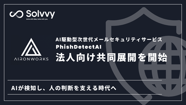 Solvvy株式会社(本社:東京都、代表取締役:安達慶高、以下「当社」)は、Agentic AIによる次世代型サイバーセキュリティプラットフォームを提供するAironWorks株式会社(本社:東京都港区、代表取締役CEO:寺田彼日、以下「AironWorks」)と提携し、法人向けに、AI駆動型次世代メールセキュリティ技術を活用したフィッシング攻撃対策ソリューション「PhishDetectAI」の共同展開を開始しました。