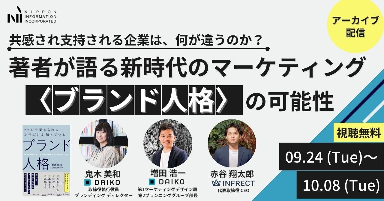 日本インフォメーション株式会社(代表取締役社長:斎藤 啓太 以下、日本インフォメーション)は2024年9月12日(木)に開催したオンラインセミナー『共感され支持される企業は、何が違うのか? 著者が語る「新時代のマーケティング 〈ブランド人格〉の可能性」』のアーカイブを無料配信します。